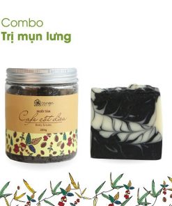 Combo mụn lưng bao gồm Xà bông Tinh than tre và Muối tắm cafe Cốt dừa dùng tắm thay sữa tắm/ xà bông công nghiệp. Các hạt café khi massage sẽ làm cho da hồng hào, mịn màng hơn. Xà bông than hoạt giúp làm sạch mụn lưng, phù hợp với tình trạng mụn sần do tắc lỗ chân lông.
